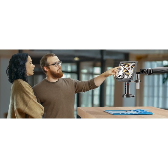 13MP 1080P digitaalinen mikroskooppikamera: digitaalisen mikroskoopin kamerassa on tuotu sensori. Teollisuusmikroskooppi voi tuottaa 1080P HD -kuvaa HDMI- ja VGA-liitäntöjen kautta. 150X zoom C-kiinnityksellä: digitaalisessa mikroskoopissa on 150X zoom C-kiinnityksellä varustettu objektiivi, jonka suurin työetäisyys on jopa 1000 mm ja näytön suurennus on 1–150X. Voit säätää suurennusta objektiivin pyörivällä nupilla. Teollisuusmikroskooppi sopii monenlaisiin työtehtäviin, kuten elektroniikkalaitteiden korjaukseen, kolikoiden tarkkailuun jne. Kirkas LED-valo: digitaalisessa mikroskoopissa on kirkas LED-rengasvalo. Rengasvalo koostuu 56 kirkkaasta LED-helmestä, ja valon värilämpötila on 6500K–7000K. Rengasvalon kirkkautta voidaan säätää, ja sen suurin valaistusvoimakkuus on 60 000 luksia. Rengasvalon ansiosta videomikroskoopilla saadaan selkeämpiä kuvia ja videoita työskennellessä. Joustava jalusta, kaukosäädin. Digitaalisessa mikroskoopissa on uusin päivitetty jalusta. Tämä jalusta on erittäin joustava ja vakaa. Jalustan neljää osaa voidaan säätää eri kulmiin. Voit valita sopivimman asennon näytteiden tarkkailuun selkeämmin. Videomikroskooppia voidaan ohjata kaukosäätimellä, mutta tämä toiminto on käytettävissä vain HDMI-lähtötilassa. digitaalisen mikroskoopin pakkaus sisältää mikroskooppikameran x 1, linssin x 1, rengasvalon x 1, taittuvan jalustan x 1, kaukosäätimen x 1, virtapistokkeen